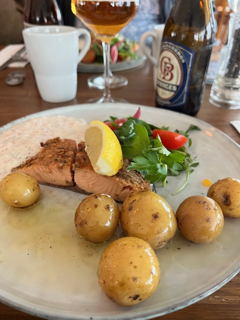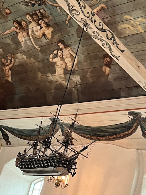 Färden gick sedan vidare till Öckerö, Fotö och Härö. Vi gjorde några kortare stopp på vägen och Bosse (som bott på Öckerö många år) berättade om många platser på ett mycket intressant och personligt sätt. Vi stannade så vid Hönö Klåva (Hönös hamn) där vi fick tid att strosa omkring och besöka några fina små butiker. Några trevliga inköp blev det också. Sedan samlades vi i Fiskemuseet där vi fick information och vandrade runt. Lunchen intogs på restaurang Tullhuset och bestod av varmrökt lax med romsås, sallad och nypotatis. Kaffe och kaka, allt mycket gott! Mätta och belåtna åkte vi tillbaka till Öckerö för besök i den gamla träkyrkan (Mariakyrkan). Här fick vi höra en inspelad berättelse om kyrkans historia och dess vackra målningar och övriga inventarier. När vi kom ut från kyrkan tittade solen äntligen fram och vi fick till slut se lite glittrande hav innan det var dags att ta båten Beda tillbaka till fastlandet. Vår chaufför Thomas körde igenom Göteborgs centrum och kryssade galant genom rusningstrafiken. Nöjda och belåtna med denna trevliga dag var vi hemma i Vätterbygden klockan 19. Stort tack till Thomas för säker körning och till Bosse för en välarrangerad och trevlig resa!