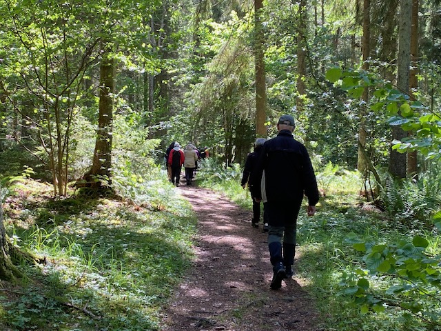 Vi gjorde två studiebesök och tre vandringar i dessa gamla kulturmarker. Skälvums kyrka byggd i sandsten på 1130-talet ståtade med koboltblå inredning. På stenindustrimuseet i Råbäcks hamn fick vi guidning men även se hur en stenhuggare konstnärligt förfärdigade ett nytt solur till Husaby kyrka.