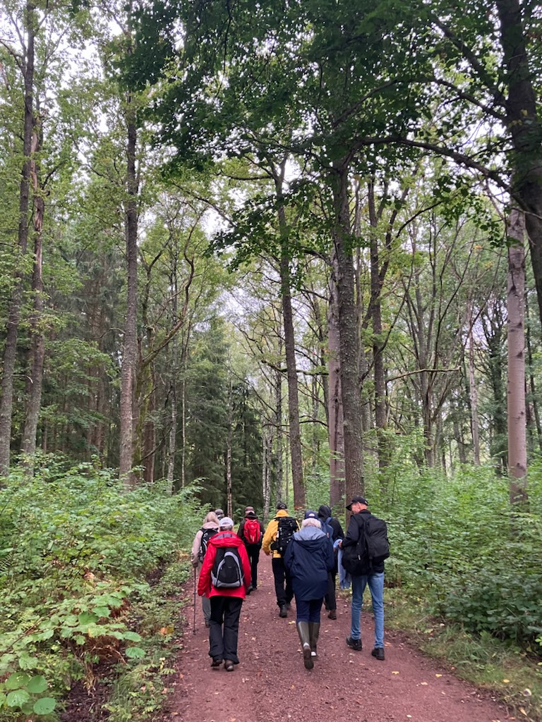 Framme på Torpön släppte bussen av oss mitt på ön i jämnhöjd med Bodaberget och vi började vandringen på Östgötaleden med en ca 1 km lång uppförsbacke varefter ett efterlängtat stopp med förmiddagsfika gjordes. Vandringen fortsatte i lätt duggregn till Svensbo naturreservat med sin rika lövskogsfauna.